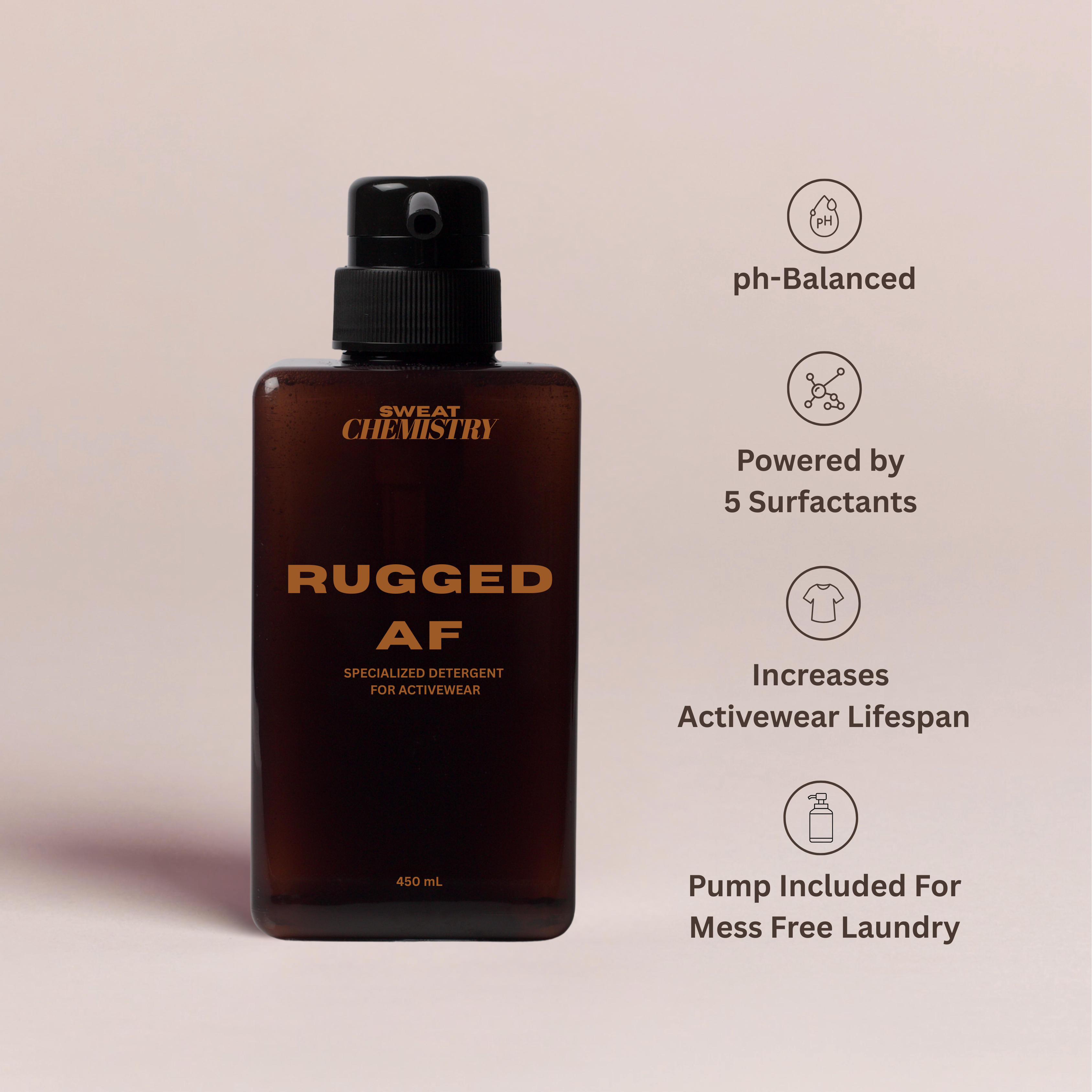 RUGGED AF is engineered with a balanced, low-residue formula that uses five carefully selected surfactants to break down sweat, oil, and bacteria without damaging the structure of technical fabrics. By avoiding common irritants and maintaining fabric integrity, it helps preserve stretch, fit, and breathability, extending the functional lifespan of your activewear.